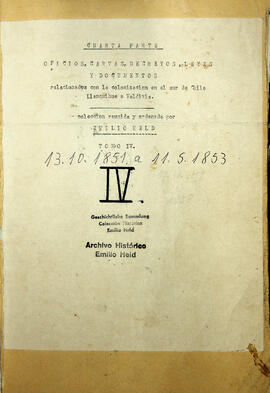 Oficios, Cartas, Decretos, Leyes y Documentos Relacionados con la Colonización en el Sur de Chile Llanquihue a Valdivia. Cuarta Parte